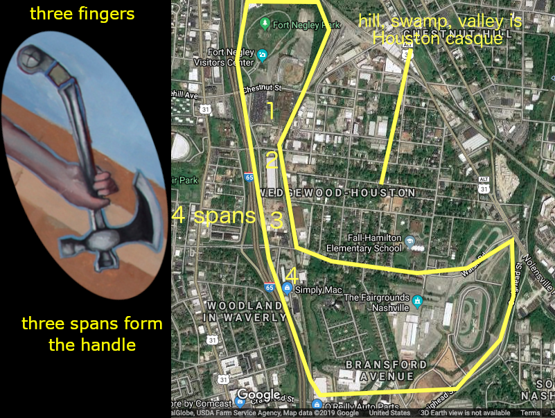 Looking closely at the first three spans, we can see that they form the handle of the tomahawk. This is why 3 fingers are shown gripping it. Fort Negley is the base of the handle. Craighead St, Wedgewood Ave, and Walsh Rd form the blade.