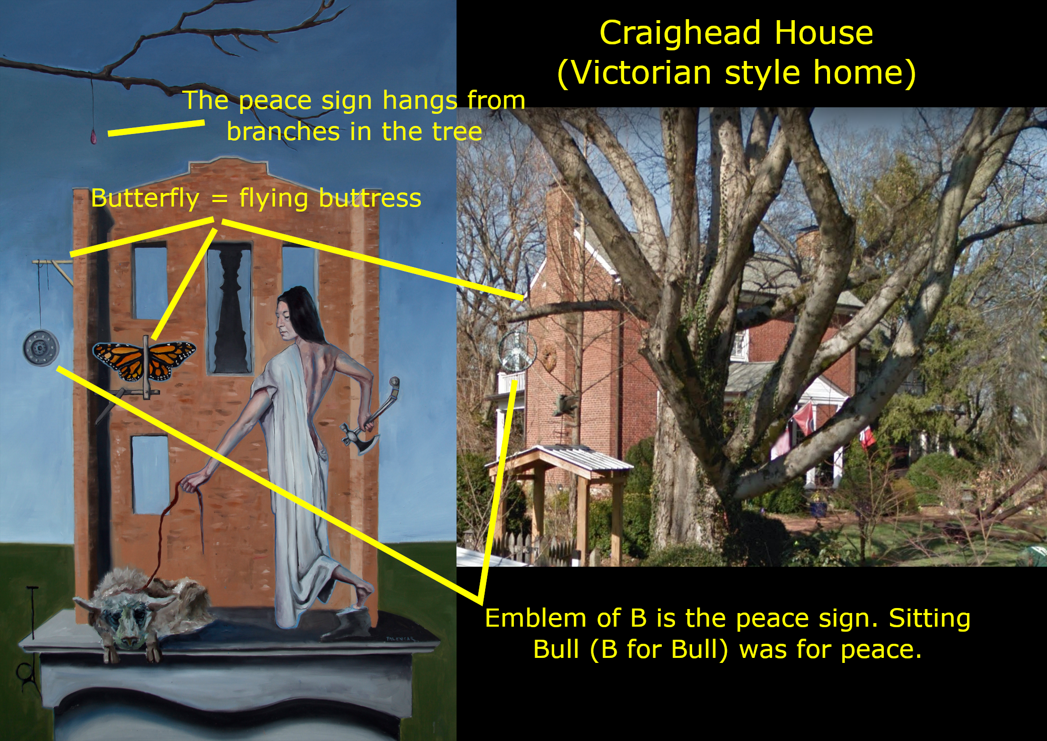 Notice the Victorian style, the brick color, the position of the windows, and the shadow running down the left side of the house. The peace sign is the emblem of Sitting Bull (B). The butterfly is a flying buttress – an external support system used for old walls. The gem hangs from a tree just like the peace sign hangs.