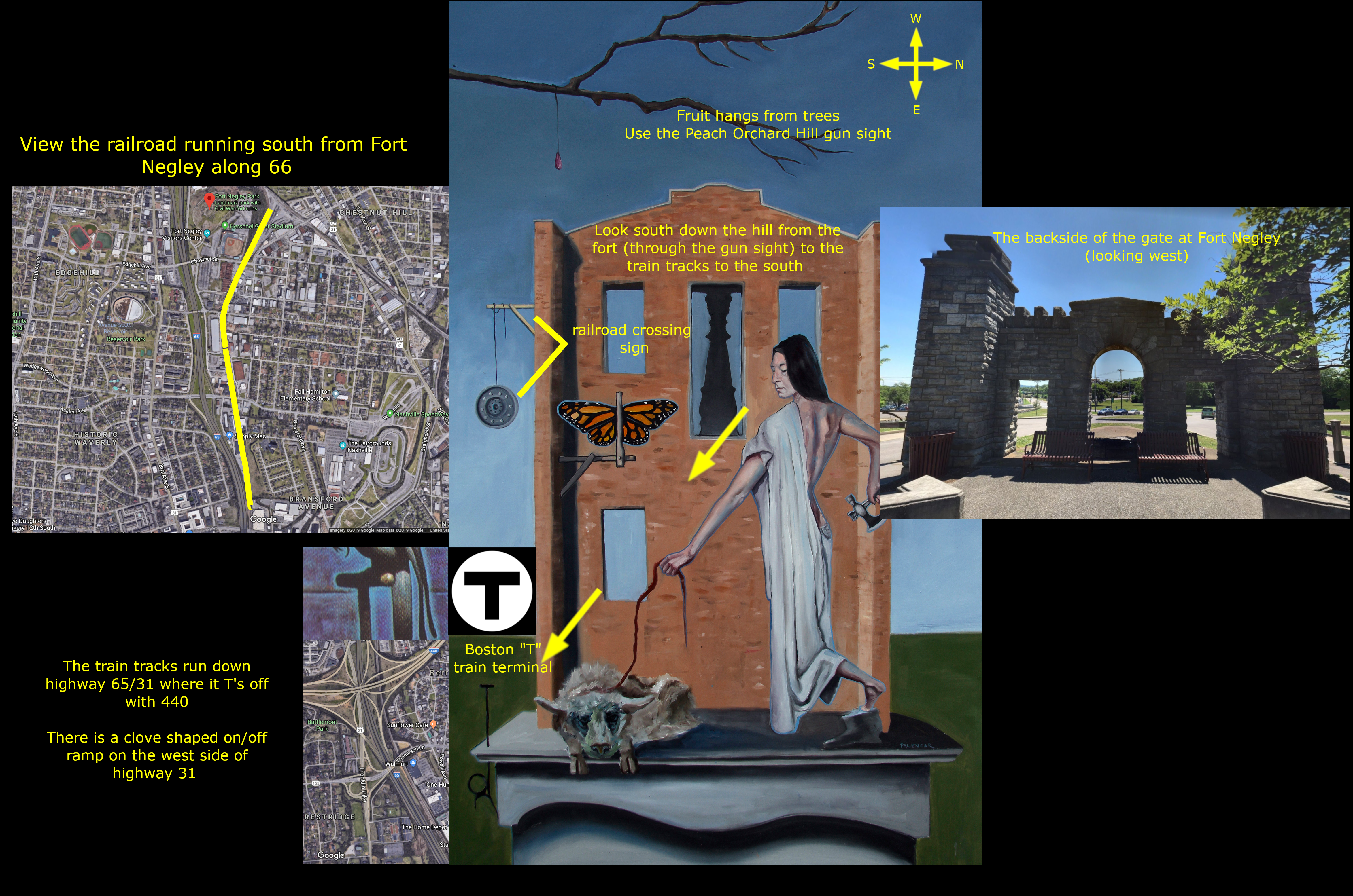 The Peach Orchard Hill gun-sights peer south from the fort. We see train/railroad symbols in the image. This means to peer south through the gun-sight and view the railroad. The “hub” is a rail car wheel. Nashville is a huge railroad hub, and there is a giant rail station a few miles south of the fort.