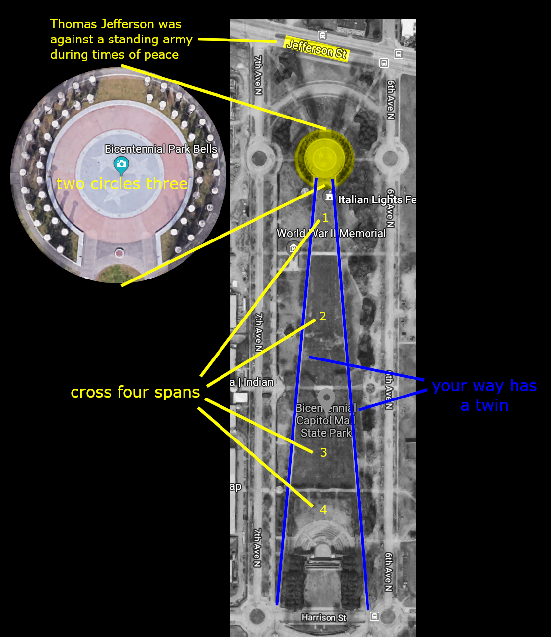 What city sits near the divide between the North and the South (Missouri Compromise Line), and the divide between east and west (Mississippi), and was on the Trail of Tears? Nashville. Looking closer at Nashville, we know it is the state capital. The image comprises of a chair or “seat” symbolic of the capital. The wavy pattern is the two loop-like bends of Cumberland River and the flat line of the seat is the Missouri Compromise line. Using the Tennessee capitol building as a general starting area we can begin to interpret the verse at the Bicentennial Mall.
